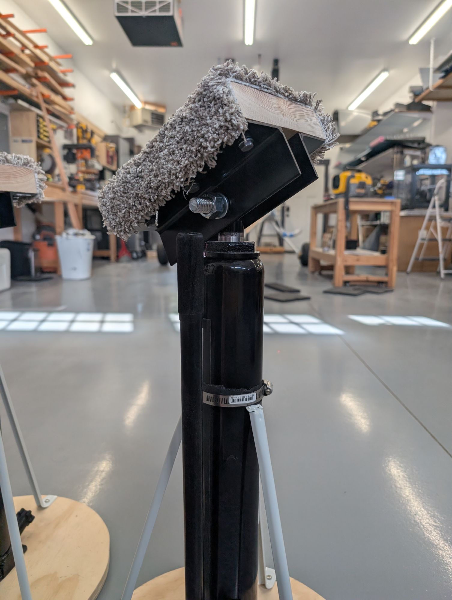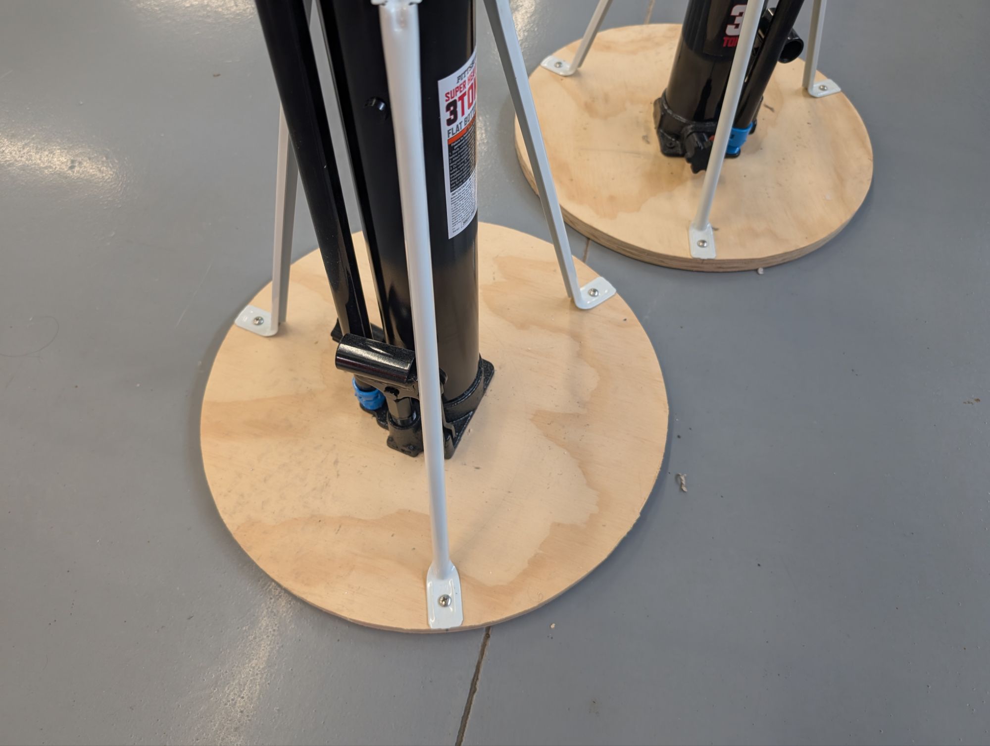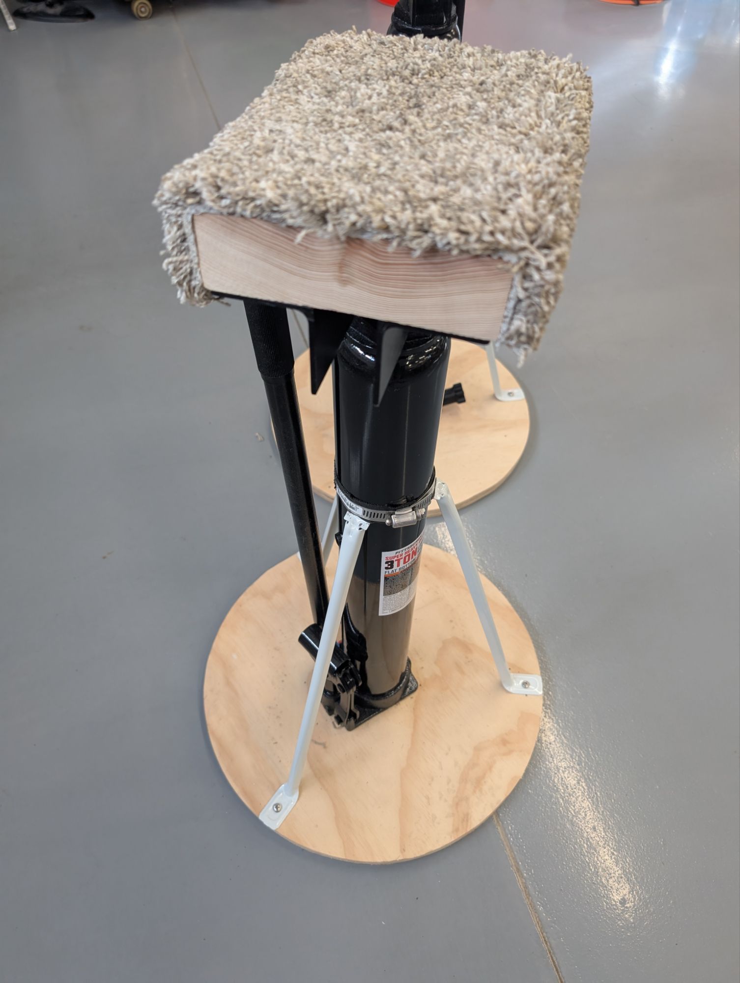 I purchased two 3-ton long ram flat-bottom hydraulic jacks from Harbor Freight. I made 3/4″ plywood bases and attached shelving supports to form a tripod support structure. I used hose clamps to secure the shelving supports to the jacks. I used friction tape under the hose clamps to keep them from sliding.