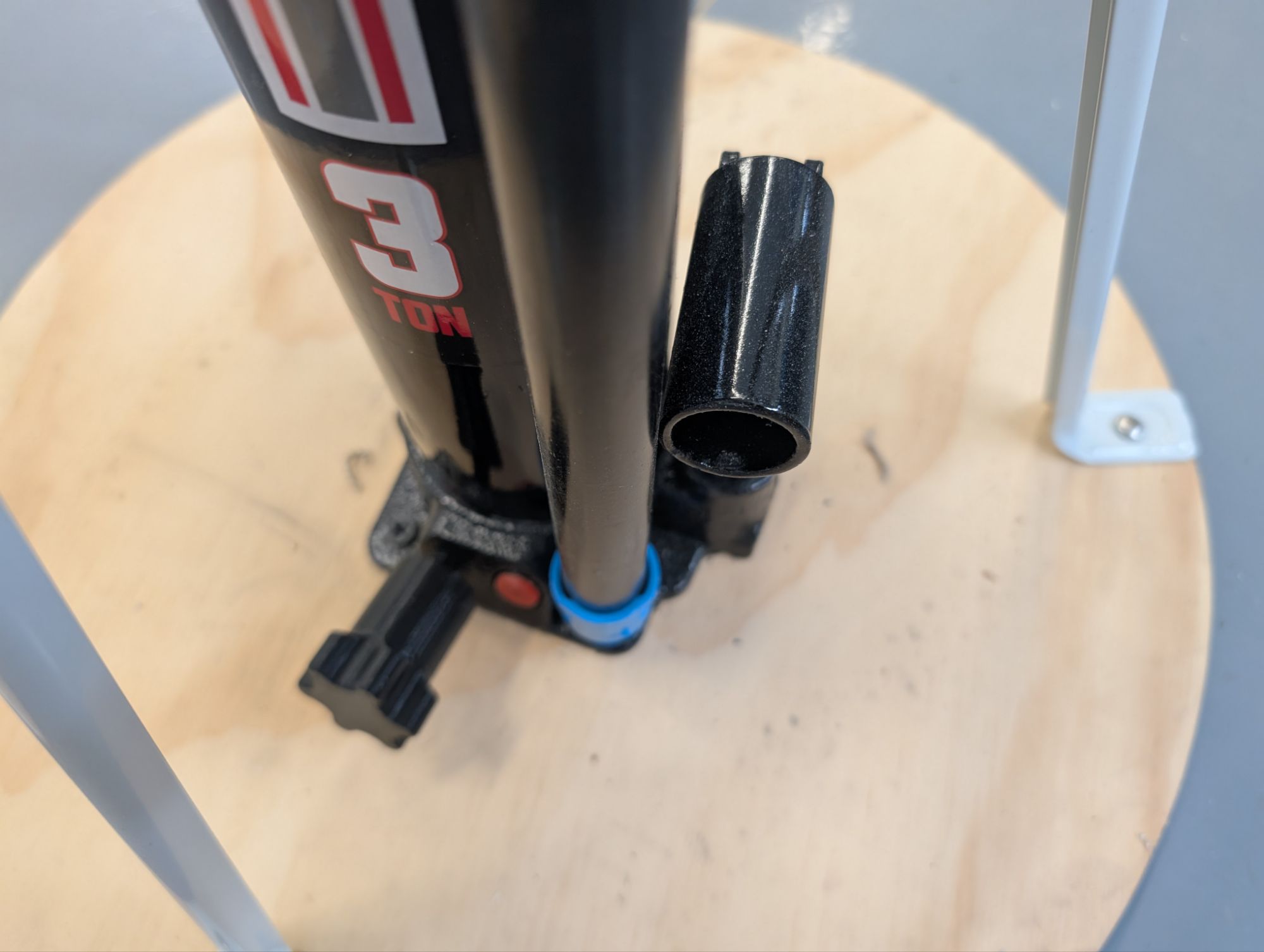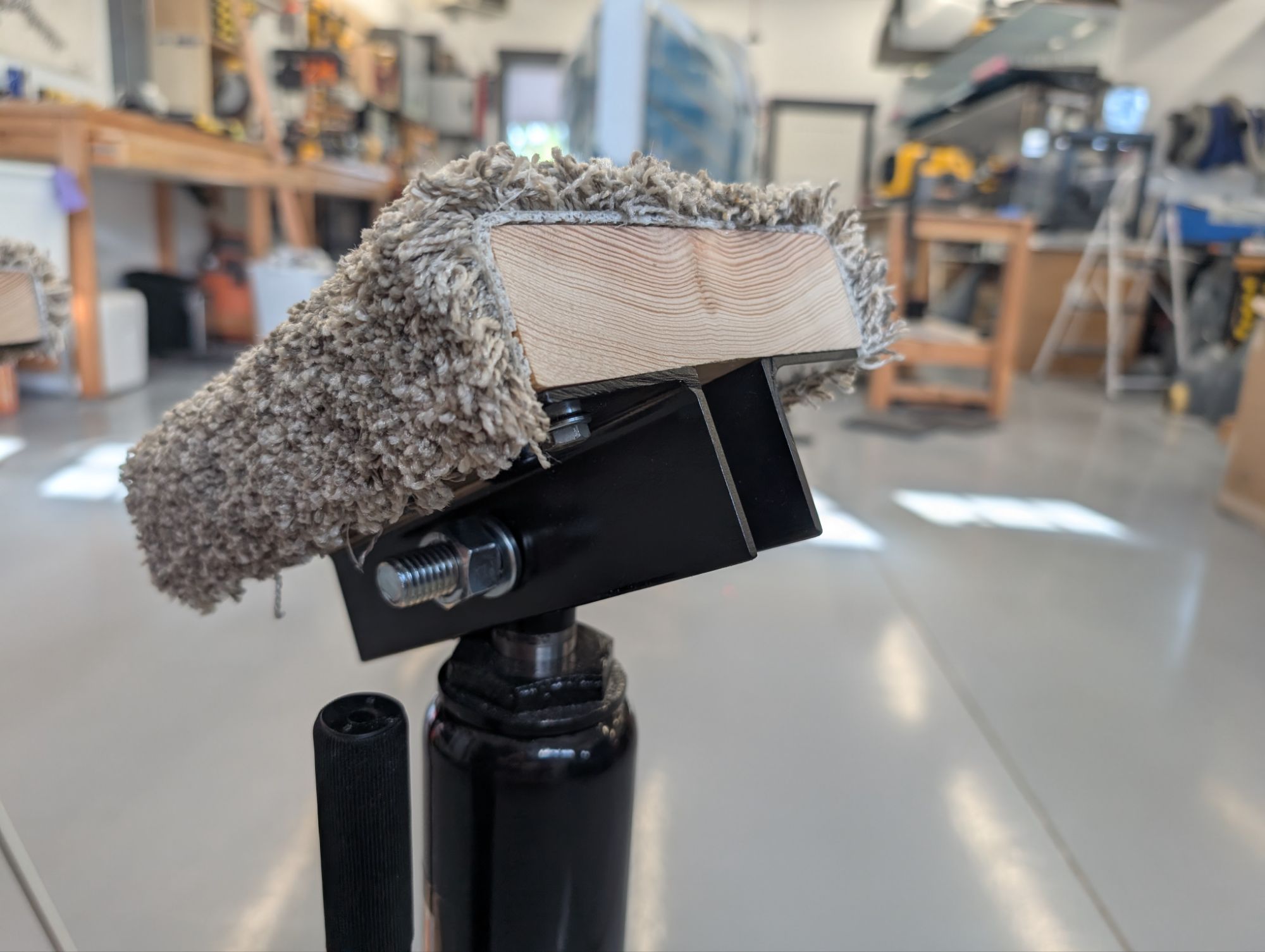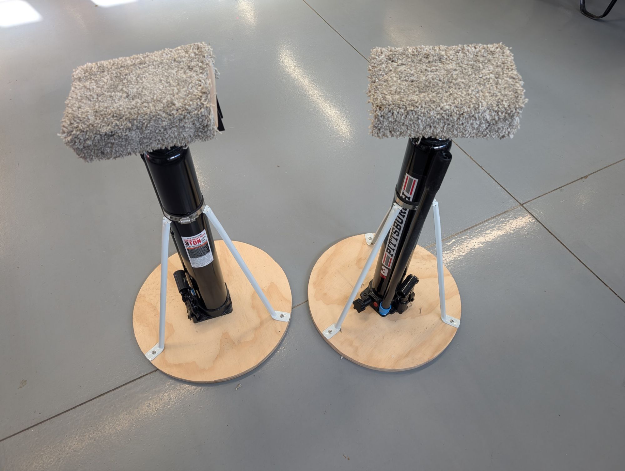 I purchased two 3-ton long ram flat-bottom hydraulic jacks from Harbor Freight. I made 3/4″ plywood bases and attached shelving supports to form a tripod support structure. I used hose clamps to secure the shelving supports to the jacks. I used friction tape under the hose clamps to keep them from sliding.